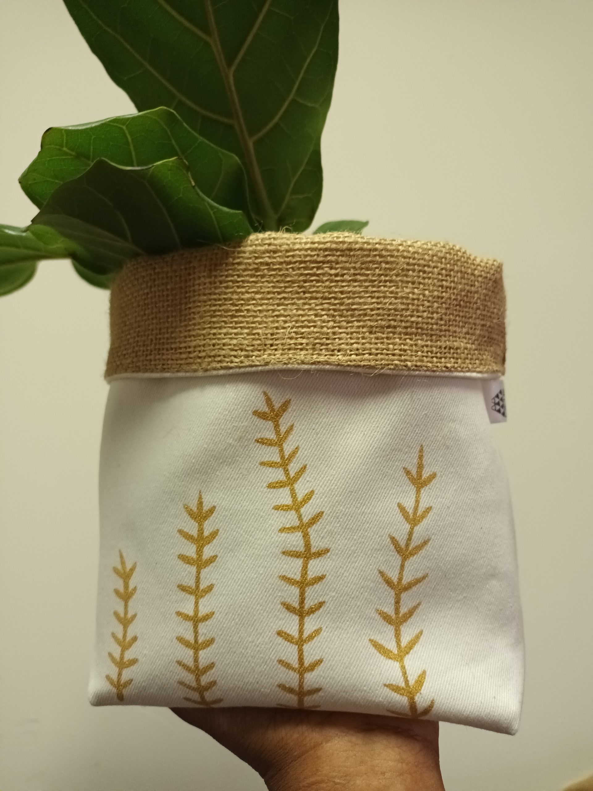 Gold leaf hand painted fabric pot.